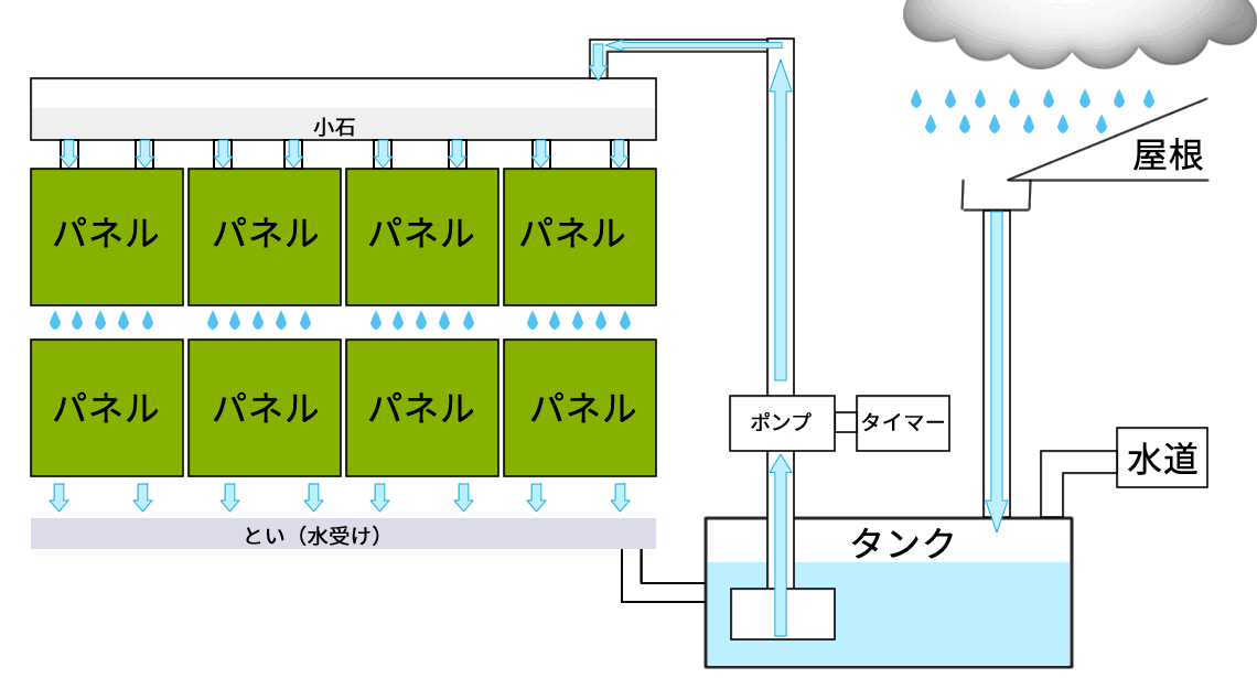 一般的な壁面緑化では、タンクに水を補給し、それを流すようになっておりますが、主に雨水を利用し、その水を自動で循環させることによりメンテナンスにおける人件費や水道料金、肥料代が大幅に軽減できます。