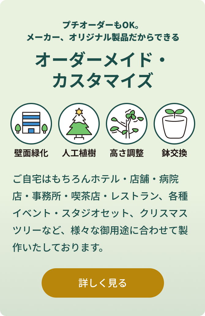 光触媒の造花観葉植物(インテリアグリーンアーティフィシャルグリーン)、光触媒造花(アートフラワー/アーティフィシャルフラワー)を中心とした造花を、自社オリジナルで製造・販売(通販)しております。