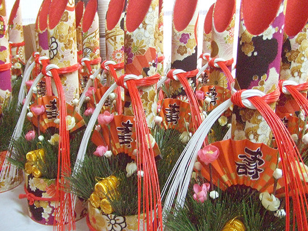 通常、門松といえば「3本」の竹の部分が「1本」。そして竹のかわりとなる「紙管(しかん)」に色鮮やかな「ちりめん」が貼り付けられています。