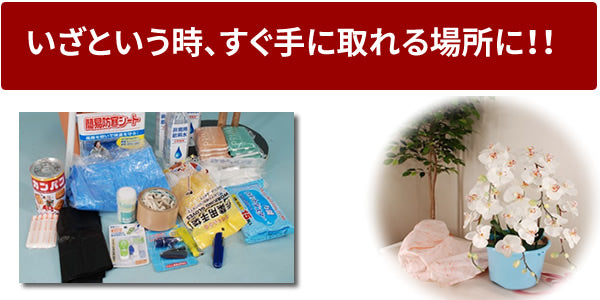 すぐ手に取れる場所に防災グッズや非常持ち出し用グッズがなくて本当に大丈夫ですか?防災グッズや非常持ち出し用グッズは、すぐにわかる場所に置いておきましょう。通常は光触媒造花としてお部屋のインテリアに、いざというときは様々な使い方のできる防災グッズとしてご利用ください。