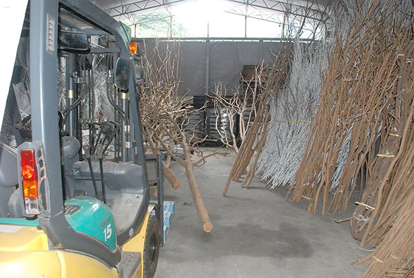 当店の原木倉庫です。お客様のニーズに対応するため、原木も様々な形状のものを準備しております。